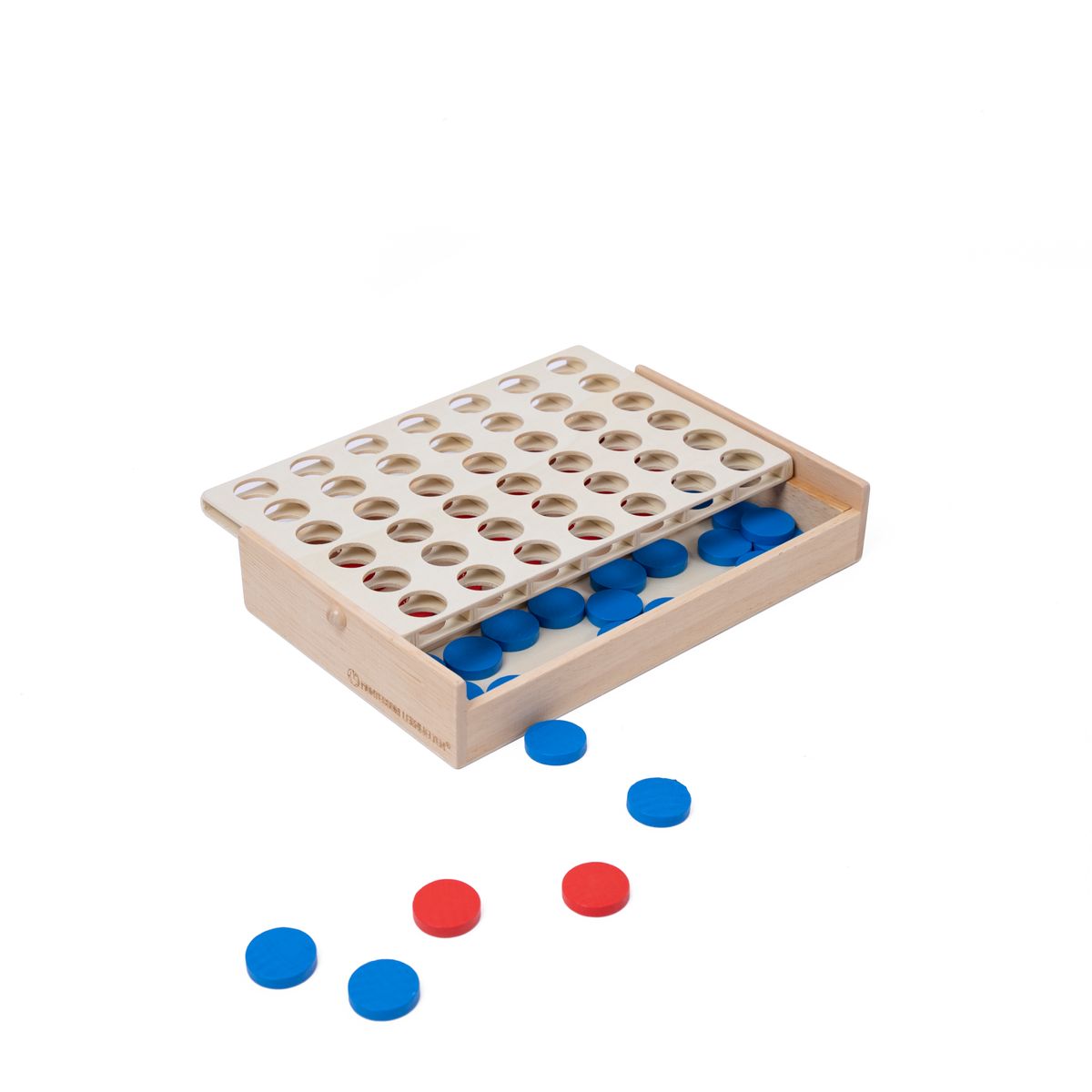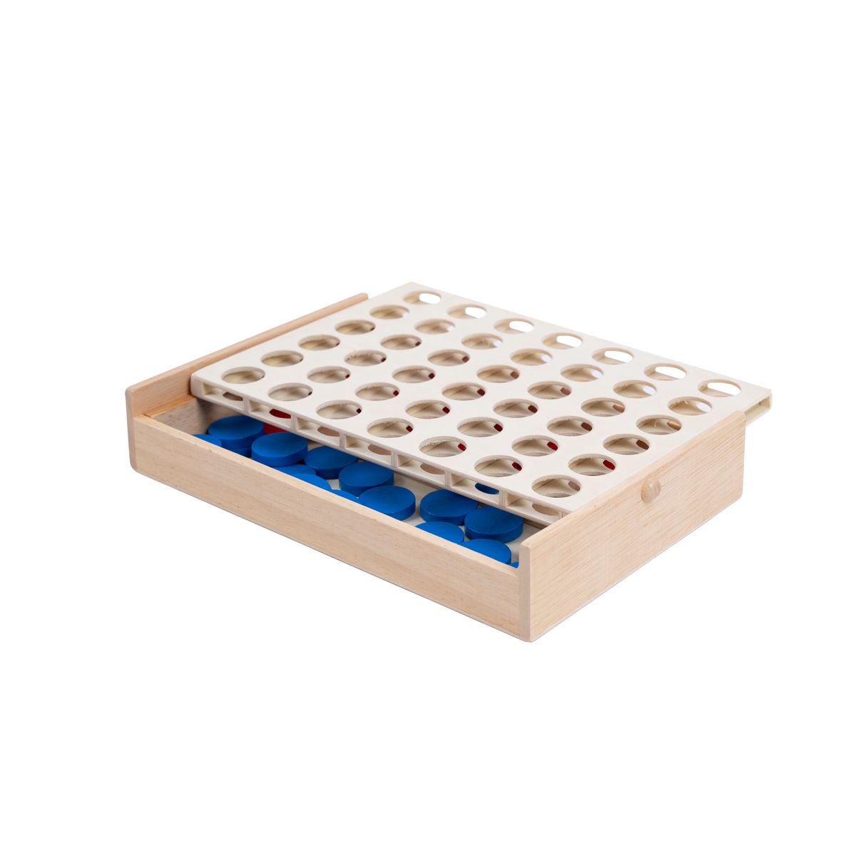 Dieses klassische Strategiespiel findet sich bereits auf Graffities aus der Römerzeit. Die Regel besteht aus einem Satz: "Bringe vier Spielsteine in eine horizontale, vertikale oder diagonale Reihe." Diese ansprechende Version aus Holz verbindet klare Gestaltung mit durchdachter Funktion: Das Spielbrett ist zugleich der Deckel der Aufbewahrungsbox. Alle Spielsteine sind ordentlich verstaut, alles hat seinen Platz. Das hochwertige Holz lädt zum Anfassen ein, wirkt ruhig und wertig – genau das, was Kinder oder Erwachsene brauchen, um sich ganz auf das Spiel einzulassen.