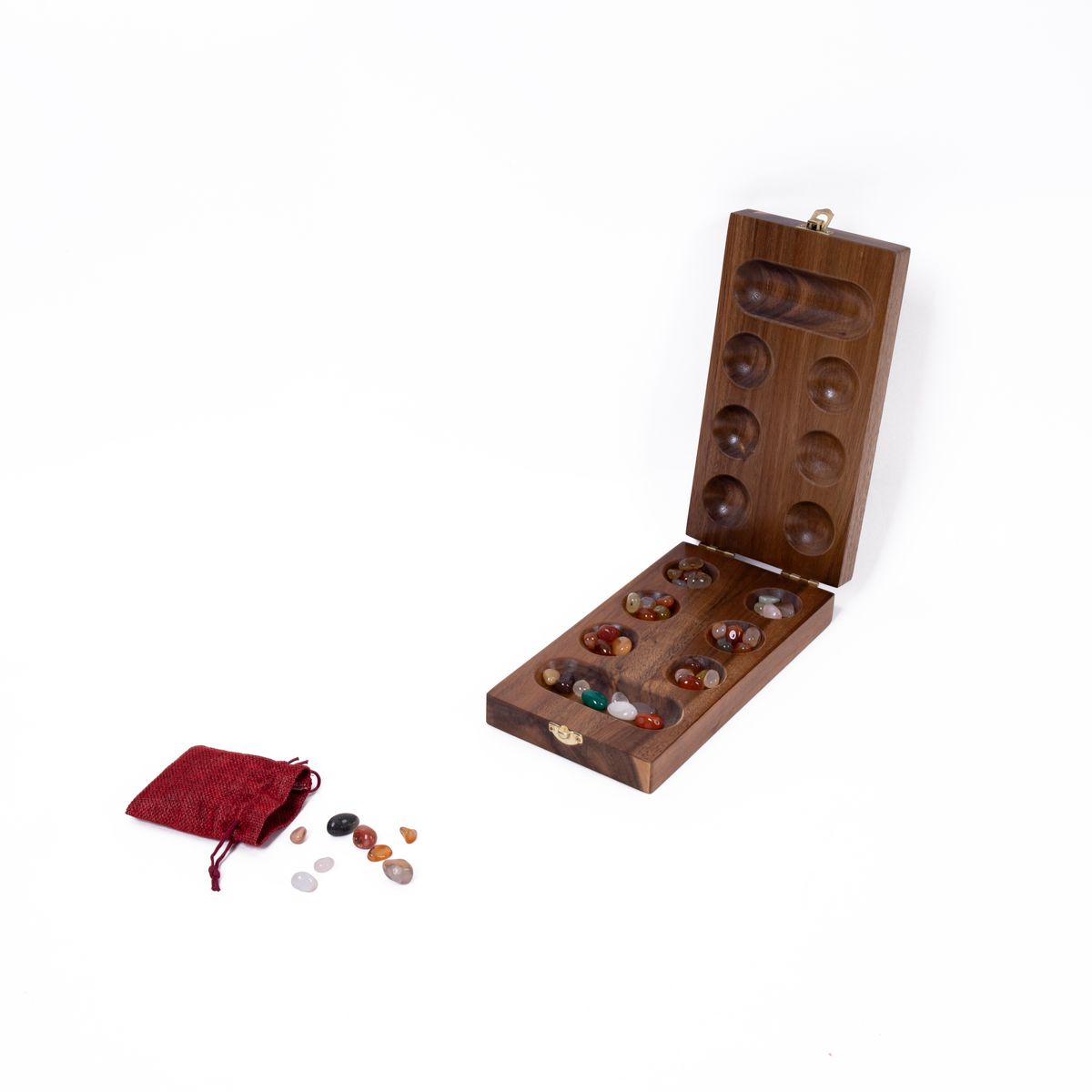 Dieses hochwertige und formschöne Kalaha-Spiel aus massivem Holz verbindet zeitlose Spieltradition mit klarer Montessori-Ästhetik. In der ästhetischen Holzbox sind die Mulden präzise ausgearbeitet und laden dazu ein, Spielsteine ruhig, bewusst und mit beiden Händen zu bewegen. Die bunten, transparenten Halbedelsteine sind eine Freude für das Auge und liegen angenehm schwer in der Hand. So sorgen sie für konzentrierte, entschleunigte Spielatmosphäre. Durch den klappbaren Aufbau und den Verschluss lässt sich das Brettspiel sicher aufbewahren und leicht transportieren – ideal für den Einsatz zu Hause, in der Schule, im Park oder im Urlaub.