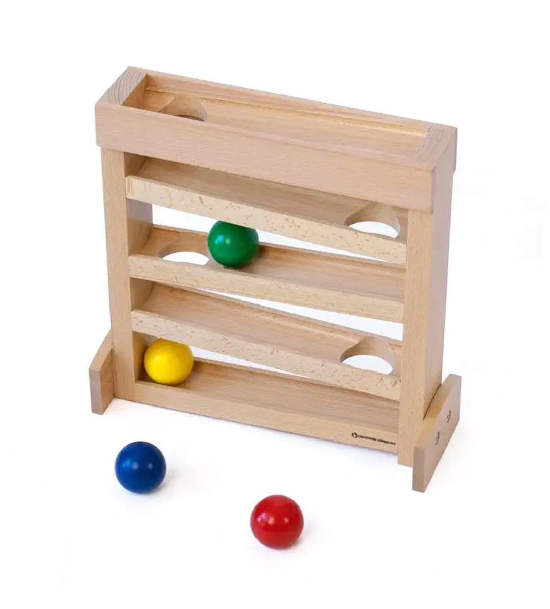 Die Kugelbahn ist ein Klassiker unter den Kinderspielen. Besonders jüngere Kinder lieben es, durch eine kleine Bewegung einen weiten Lauf der Kugel verursachen zu können. Die Kugeln werden dazu auf die höchste Bahn gesetzt und dabei beobachtet, wie sie über die Bahnen und durch die Aussparungen nach unten rollen. Dabei wechselt die Kugel immer wieder die Rollrichtung. Es können auch mehrere Kugeln hintereinander losgeschickt werden oder Kugeln unterwegs abgefangen werden. Die Kinder lernen dabei das genaue Beobachten und „am Ball bleiben“, auch wenn die Kugel kurz in der Öffnung verschwindet. Durch das Verschwinden und wieder auftauchen der Kugel kann das Kind sein Kohärenzgefühl entwickeln. Beim Aufheben und Absetzen der Kugeln wird der Pinzettengriff eingeübt. Bei der Kugellaufbahn passt der Begriff „Lernspiel“ also besonders gut.