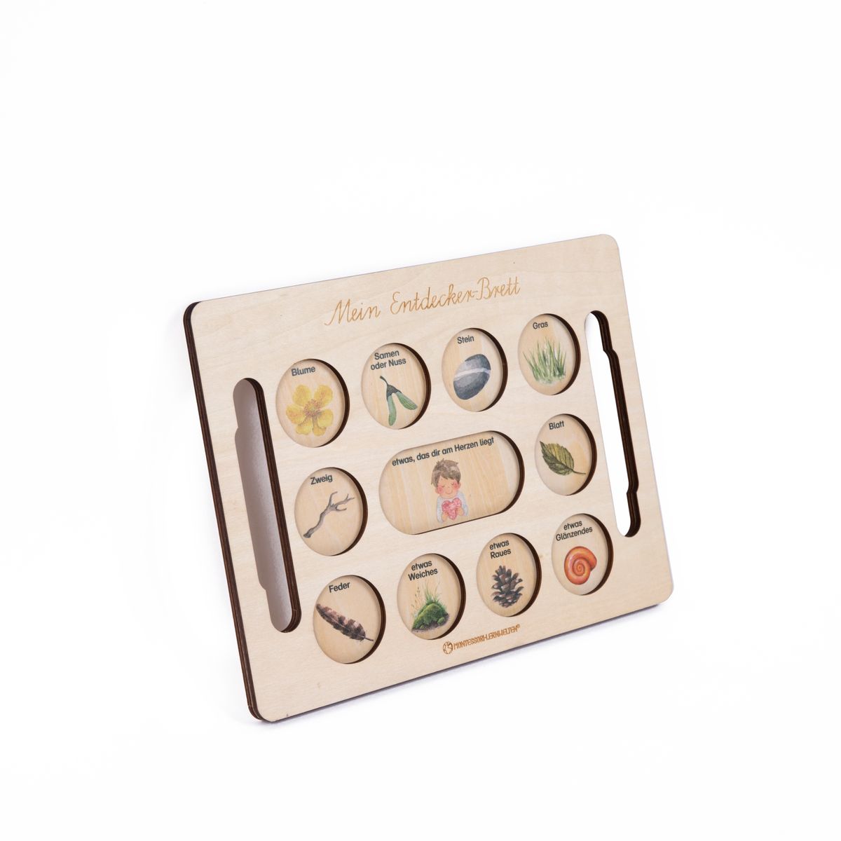Dieses liebevoll gestaltete Entdeckerbrett aus hellem Holz lädt Kinder dazu ein, ihre Umwelt bewusst wahrzunehmen und mit allen Sinnen zu erforschen. Die runden Vertiefungen bieten Platz für kleine Naturschätze wie Blüten, Samen, Steine oder Federn und machen das Sammeln und Sortieren zu einer ruhigen und geordneten Tätigkeit.