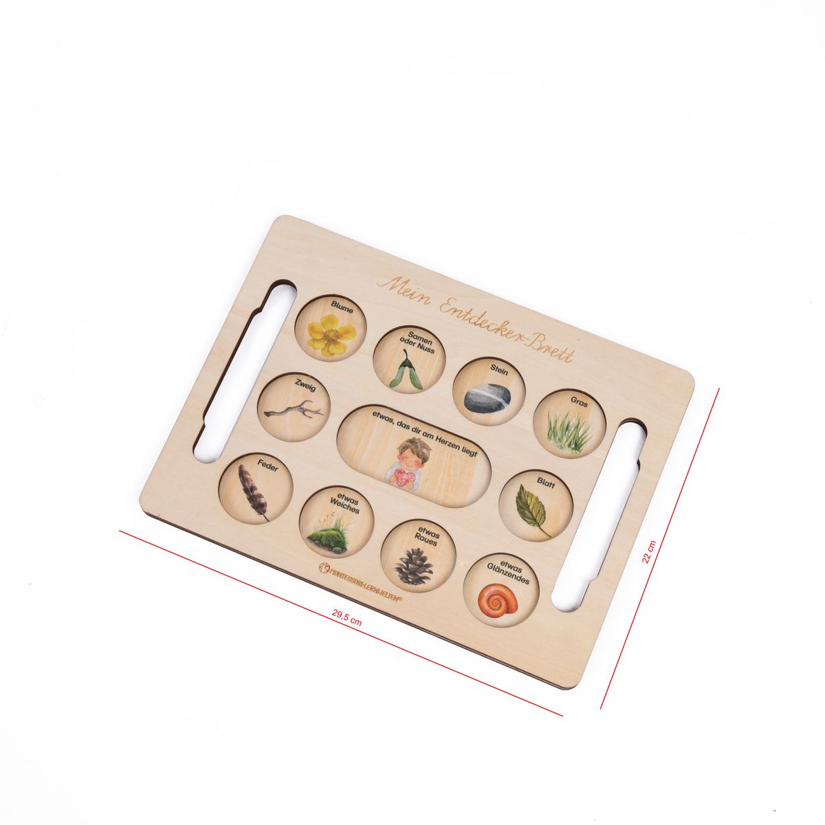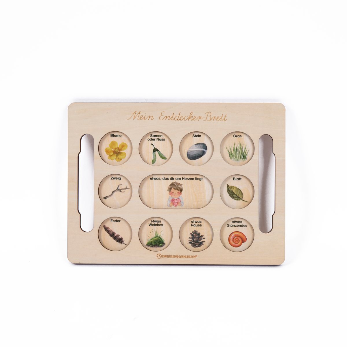 Dieses liebevoll gestaltete Entdeckerbrett aus hellem Holz lädt Kinder dazu ein, ihre Umwelt bewusst wahrzunehmen und mit allen Sinnen zu erforschen. Die runden Vertiefungen bieten Platz für kleine Naturschätze wie Blüten, Samen, Steine oder Federn und machen das Sammeln und Sortieren zu einer ruhigen und geordneten Tätigkeit. Ein ideales Material also, um auch unruhigen Kindern Ruhe und Beschaulichkeit zu ermöglichen. Beim Suchen und Sammeln lernen die Kinder, Gegenstände aus der Natur zu identifizieren und zu klassifizieren. Das erweitert ihr biologisches Wissen und die Achtsamkeit für Mutter Erde. Durch die handlichen Griffe kann das Brett leicht getragen werden – ideal für den Garten, den Waldspaziergang oder für die Arbeit am Tisch. Die zarten und wunderschönen Illustrationen geben sanfte Impulse und inspirieren die Kinder zur Erforschung und Entdeckung der Natur.