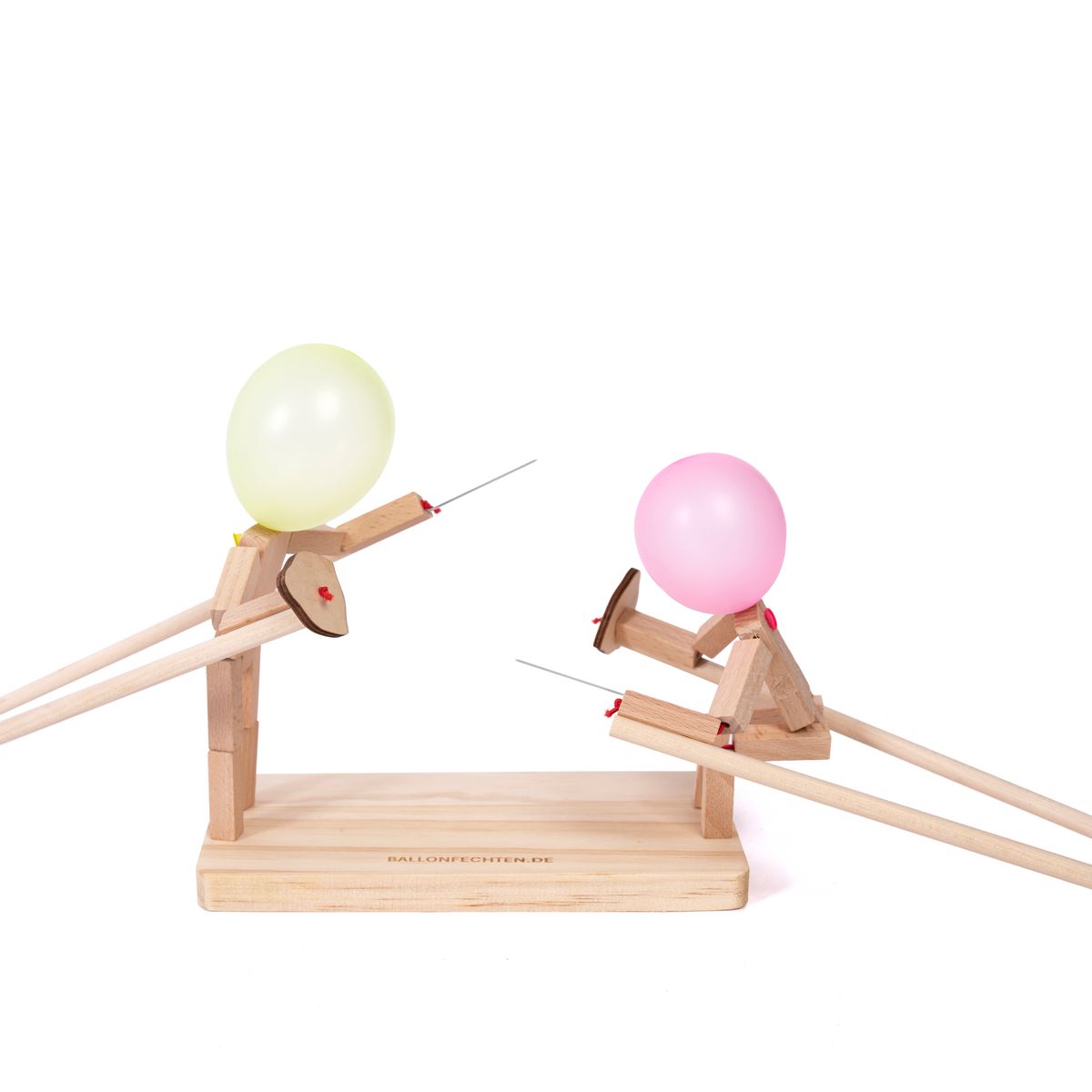 Zwei kleine Holzfiguren mit Luftballon-Köpfen fordern sich zum Duell heraus. In der einen Hand den "Degen", eine spitze Nadel, in der anderen Hand ein Schild zur Abwehr. Beide Hände werden mit Stäben von den Spielern geschickt bewegt. Wie bei einem richtigen Fechtduell geht es darum, durch geschicktes Taktieren den Gegner zu touchieren, so dass er getroffen wird bzw. sein Luftballon zerplatzt. Abwehr und Angriff müssen dabei in eleganter Balance bleiben.Die kleinen Holzfiguren können geschickt ausweichen, indem sie in die Knie gehen. Sowohl die Beine wie die Arme haben bewegliche Gelenke, so dass sich die Figuren lebensnah bewegen können. So wird das Spiel zu einem echten Duell, in dem Auge-Hand-Koordination, Beobachtungsgabe und Selbstkontrolle zum Erfolg führen.