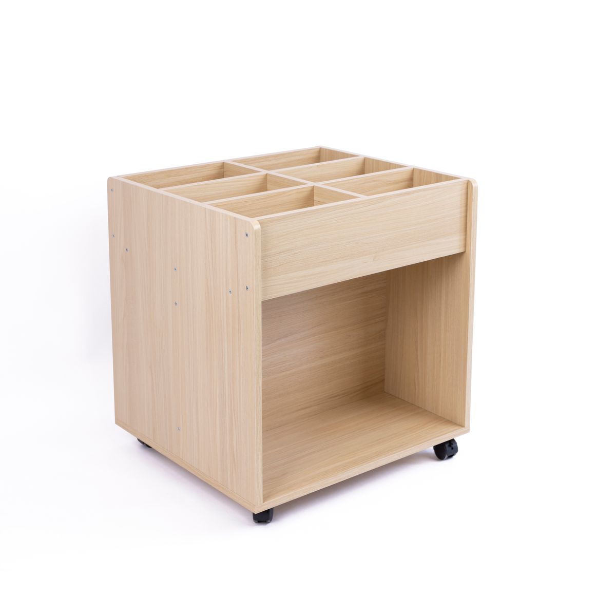 Das Rollende Bücherregal ermöglicht die Bereitstellung von Büchern und Lernmaterialien an verschiedenen Orten in einem Raum oder in einer Einrichtung. Das Regal bietet jede Menge Stauraum für Bücher, Zeitschriften und Malutensilien.