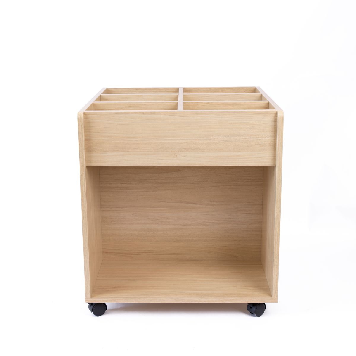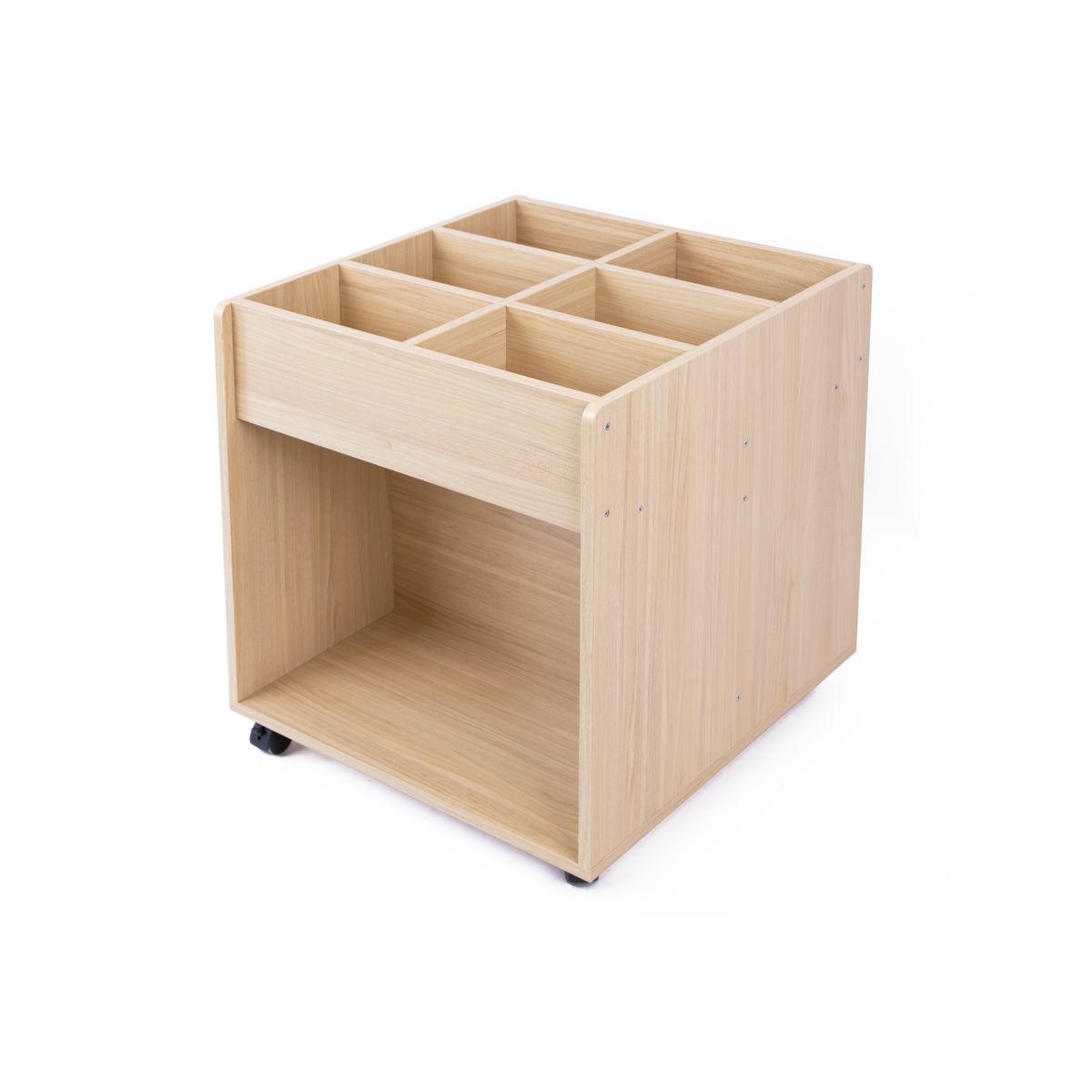 Das Rollende Bücherregal ermöglicht die Bereitstellung von Büchern und Lernmaterialien an verschiedenen Orten in einem Raum oder in einer Einrichtung. Das Regal bietet jede Menge Stauraum für Bücher, Zeitschriften und Malutensilien. Auch als flexible Experimentier-Station für Unterrichtsfächer wie Physik oder Geometrie eignet sich dieses Regal sehr gut. Die offenen Fächer animieren die Kinder dazu, die Materialien herauszunehmen und sich damit zu beschäftigen. Alle Fächer sind für die Kinder erreichbar. Die Unterteilungen ermöglichen eine systematische Aufbewahrung von Lernutensilien. Das Rollende Bücherregal eignet sich ideal dafür, in verschiedenen Klassen oder Gruppen zum Einsatz zu kommen. Bei schönem Wetter kann das Regal sogar nach draußen gerollt werden und zum Beispiel für einen anschaulichen Biologie-Unterricht dienen. Die Kinder können bequem die Bücher eins nach dem anderen durchsehen, ohne dass sie herausgenommen werden müssen wie in einem herkömmlichen Bücherregal. Kurz: Ein Regal, das sich ganz an den Bedürfnissen seiner Benützer orientiert!