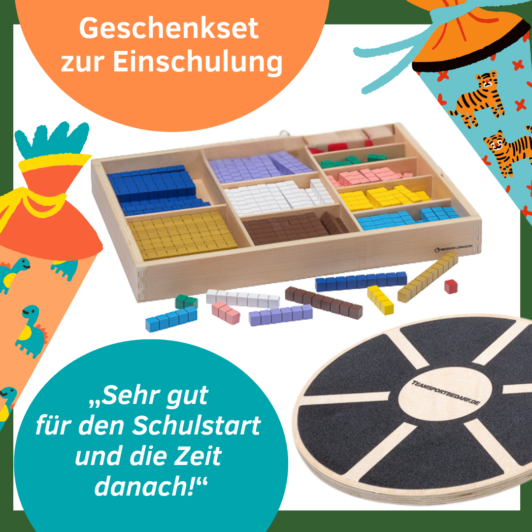Balancierend und mit Leichtigkeit durch die Grundschulzeit? Das gelingt Kindern mit diesem nachhaltigen Geschenkset zur Einschulung! Der Sportkreisel ermöglicht das bewegte Lernen zu Hause und ist damit ein echter Gamechanger für Übungen und die Hausaufgaben. Mit den Montessori-Rechenstäbchen werden Zahlen und Gleichungen für Kinder be-greifbar. So macht Mathematik Spaß!