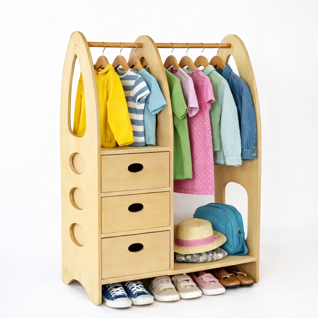 So bald ihr Kind sich für seine eigene Garderobe interessiert, ist es Zeit für dieses geniale Möbelstück. Ganz selbständig können Kinder hier ihre Kleidung in Schubladen aufbewahren, an der Stange über einen Bügel hängen oder auf den freien Flächen bereitlegen.