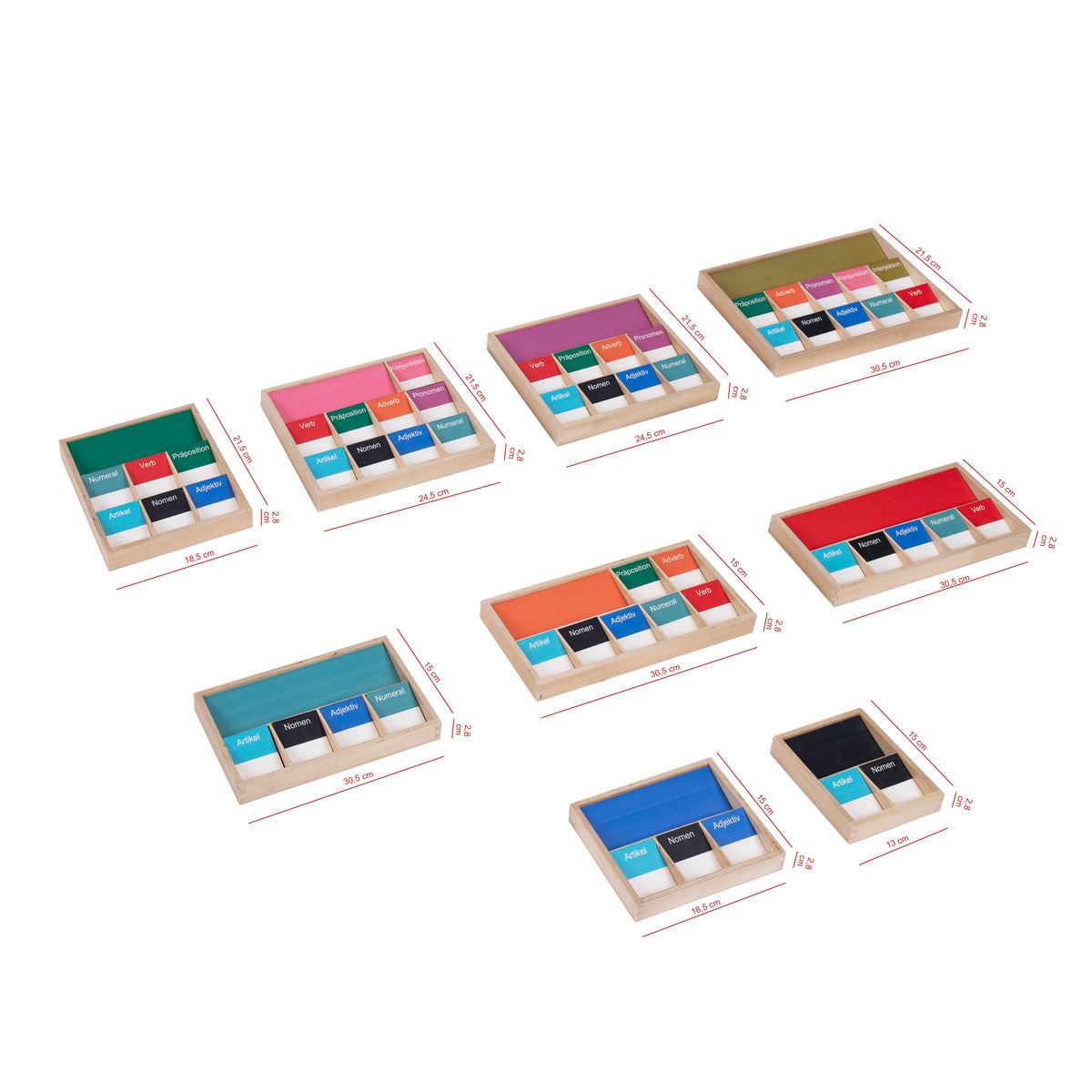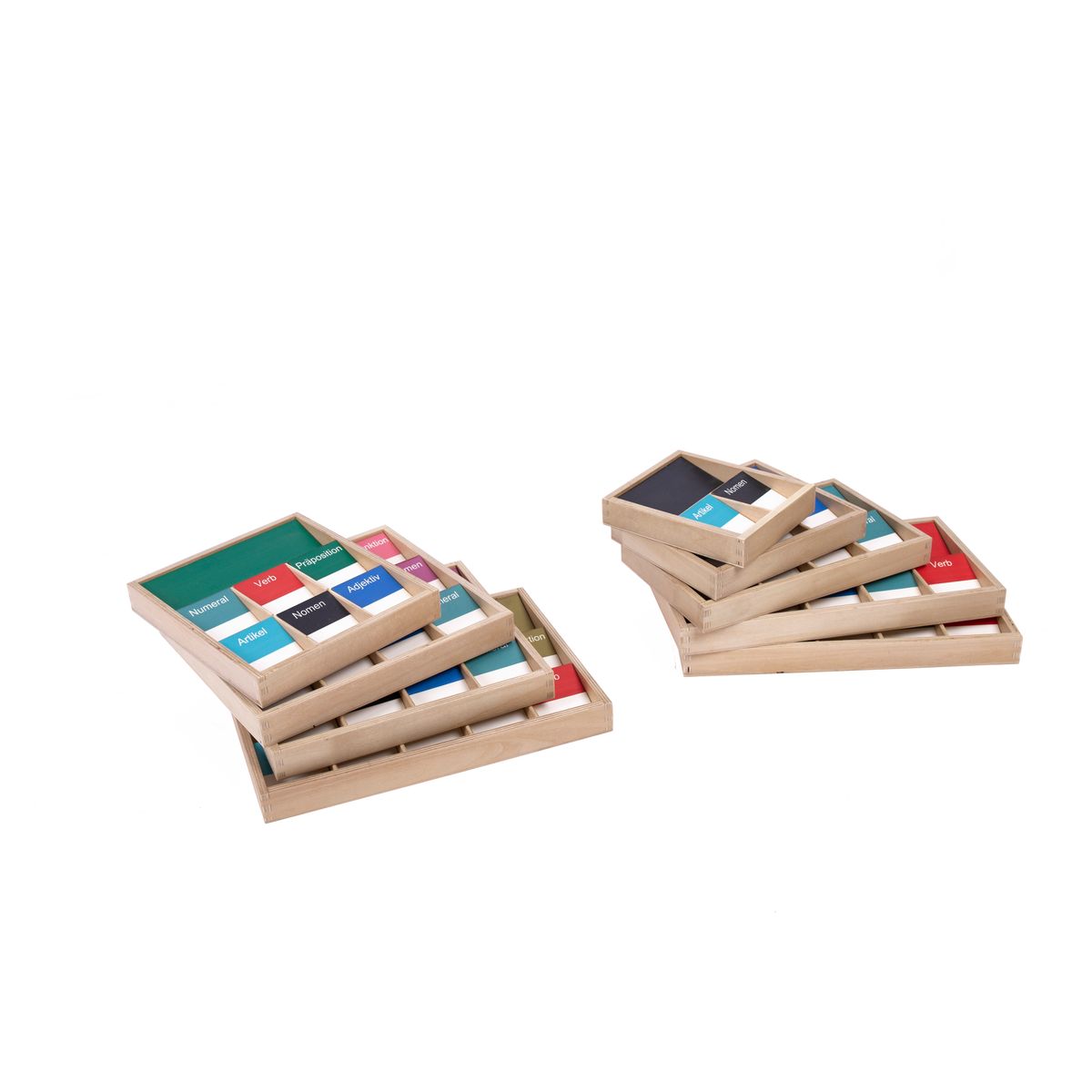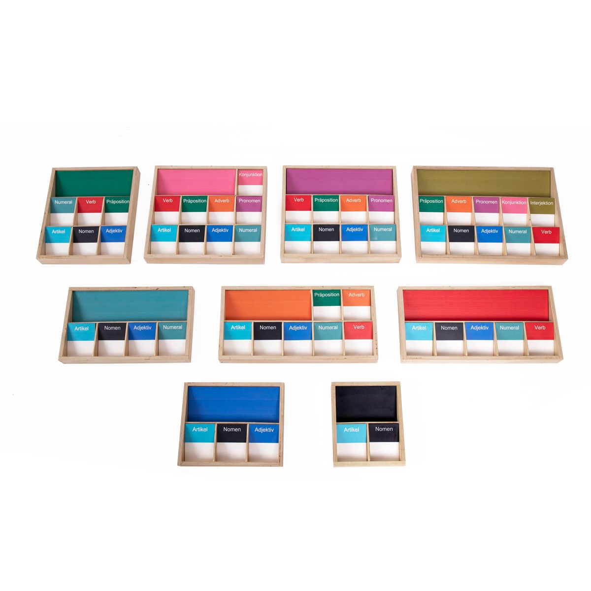 9 Holzkästen zum Sortieren der Satz- und Wortkarten