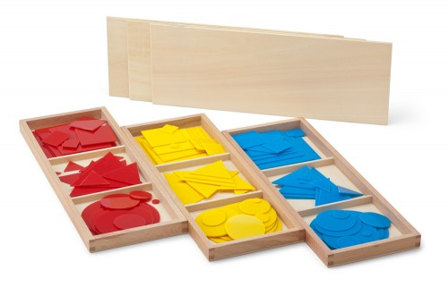 In diesen 3 Holzkästen befinden sich Dreiecke, Quadrate und KReise in unterschiedlichen Größen und Farben. Kinder können damit spielerisch geometrische Formen erforschen.