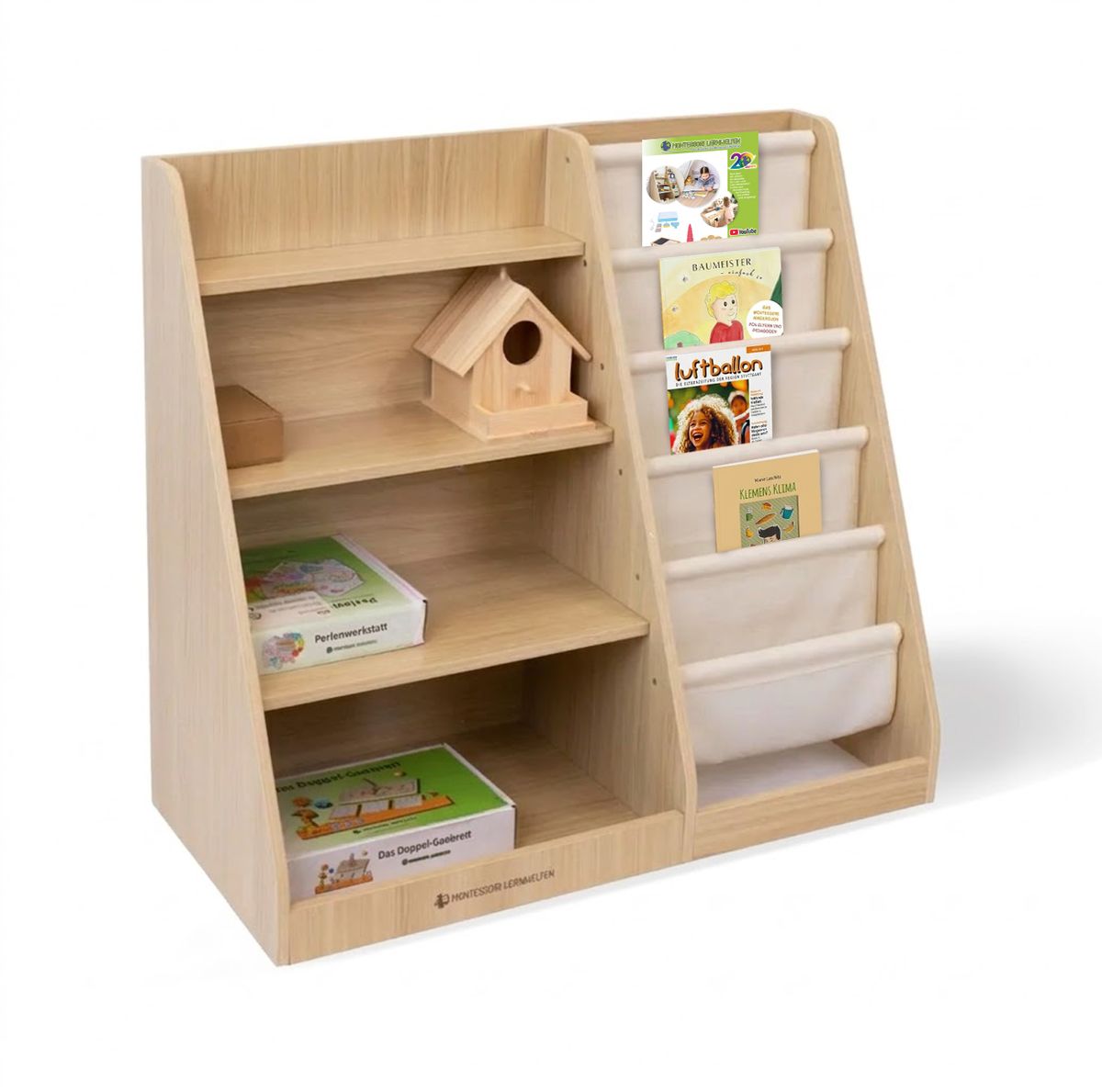 Ihr wollt eure Kinder zur selbständigen Materialwahl und zum Ordnung halten ermuntern? Mit diesem Kinderregal gelingt das ganz einfach. Kinder bekommen durch die ergonomische Form des Regals schnell einen Überblick über seinen Inhalt und können so selbstbestimmt zwischen verschiedenen Angeboten wählen. Vier Regalbretter und sechs Stofffächer präsentieren Spiel- und Lernmaterial optimal und laden dazu ein, Bücher oder Spiele bequem herauszunehmen und zu entdecken. Auch das Einräumen gelingt, dank der kindgerechten Form, ganz leicht und spielerisch. Das Kinderregal mit offenen Fächern ist als Element der vorbereiteten Umgebung über viele Jahre ein hilfreicher Lernbegleiter für eure Kinder.